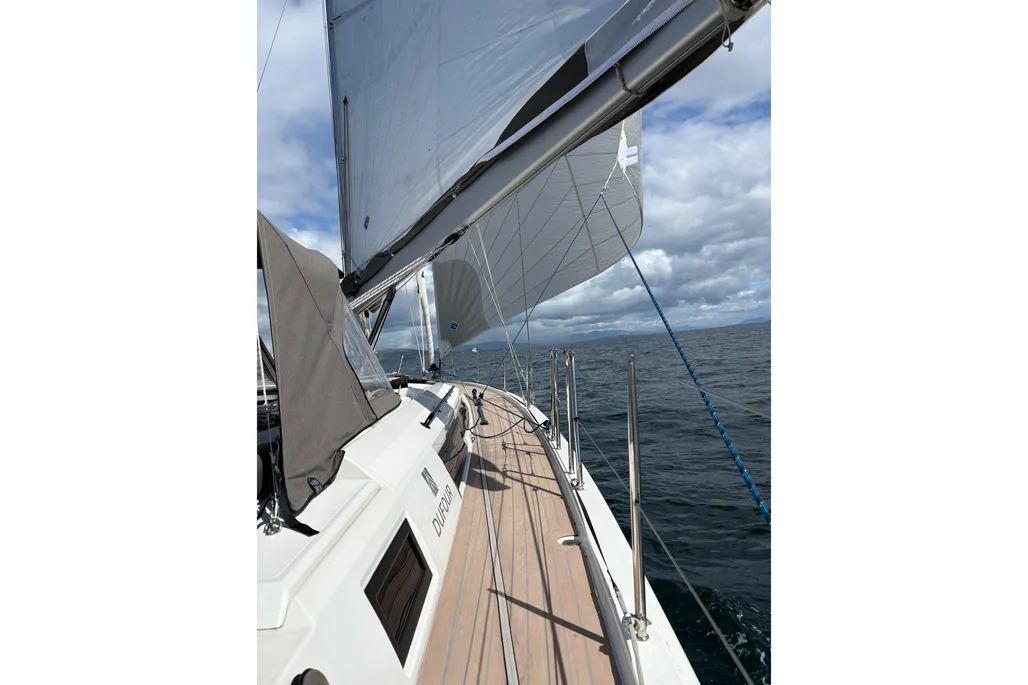 L’équipement comprend notamment une grand-voile entièrement lattée, un foc auto-vireur, ainsi qu’un gennaker enroulable et un spi asymétrique. Cette configuration permet d’adapter facilement la toile aux conditions de navigation.