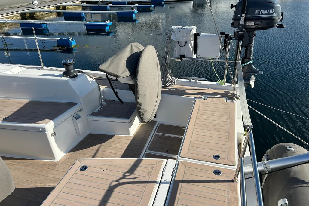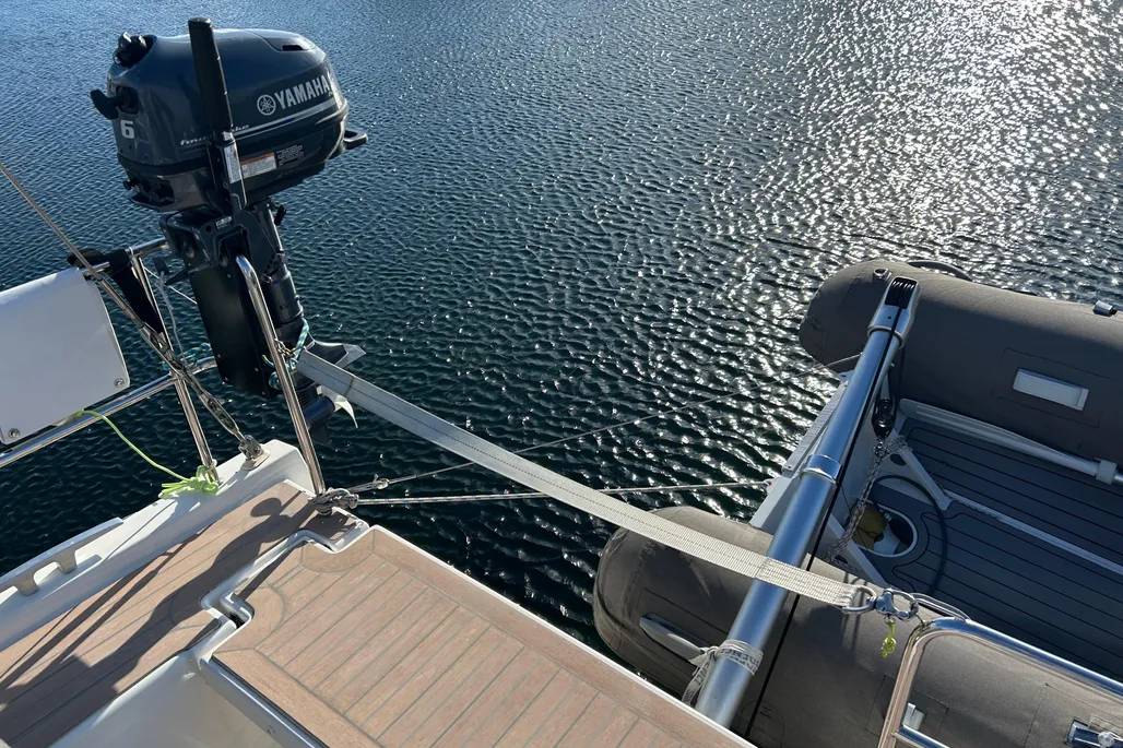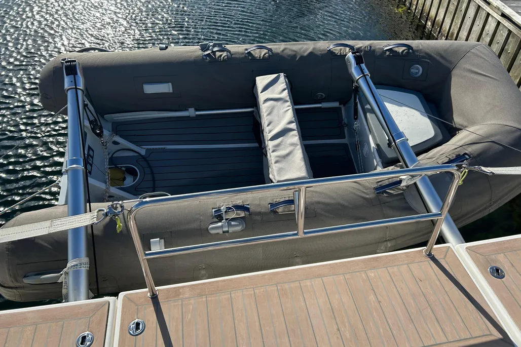 La plateforme arrière facilite l’accès à la mer. Elle permet également d’accueillir l’annexe Highfield CL310 avec moteur Yamaha 6 ch, installée sur bossoirs.