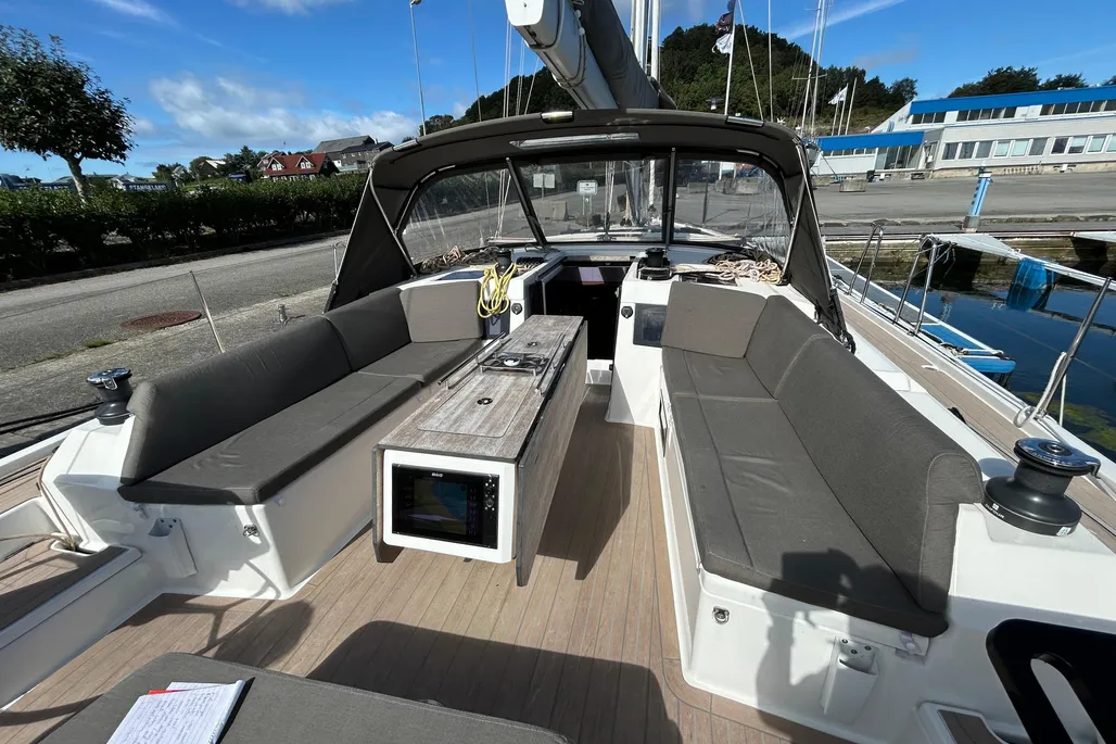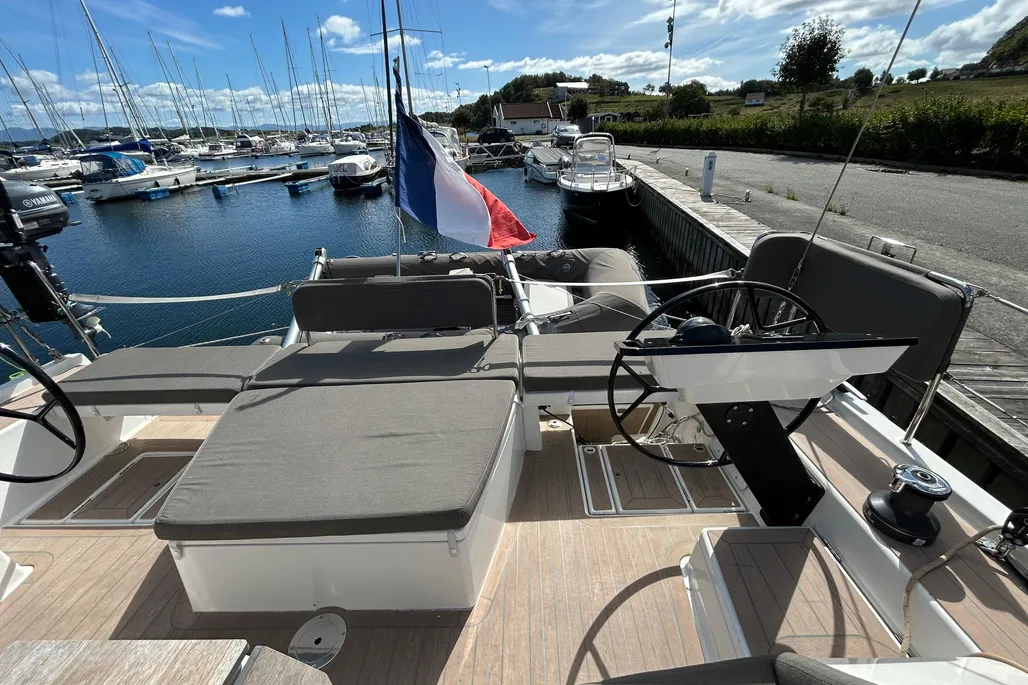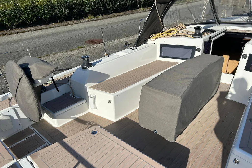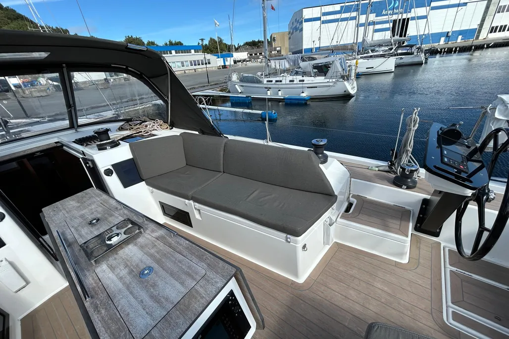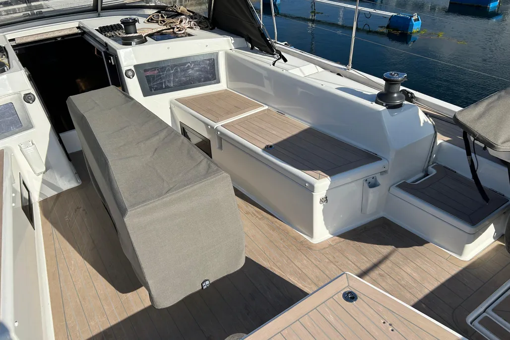 Le cockpit du Dufour 470 Smart Electric est conçu pour offrir un véritable espace de vie extérieur. Les assises larges et les coussins de cockpit créent un espace convivial pour les escales ou les navigations au large.