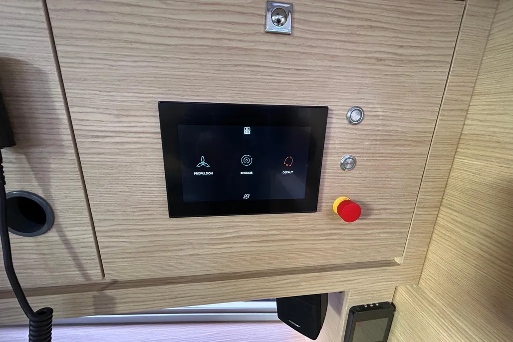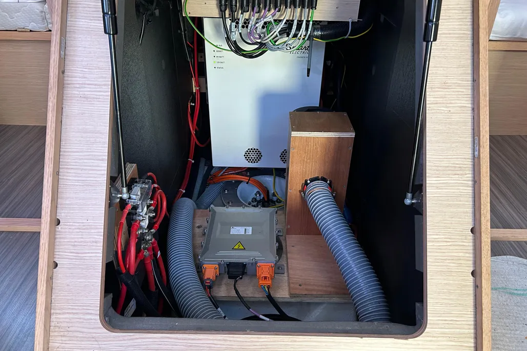 Le système repose sur un moteur électrique alimenté par une batterie de 27 kWh. En navigation, il permet d’atteindre environ 6 à 7 nœuds uniquement en propulsion électrique. La navigation devient alors silencieuse et particulièrement agréable.