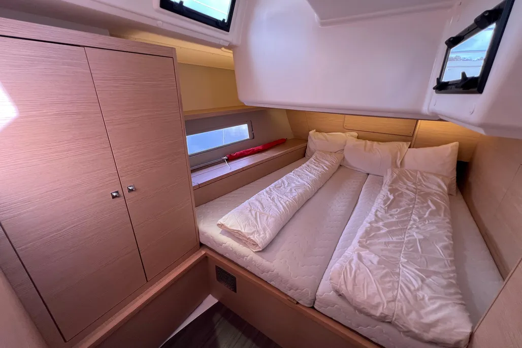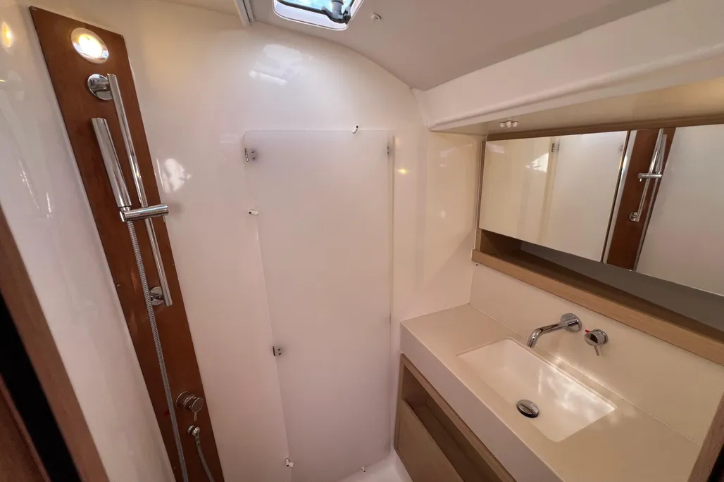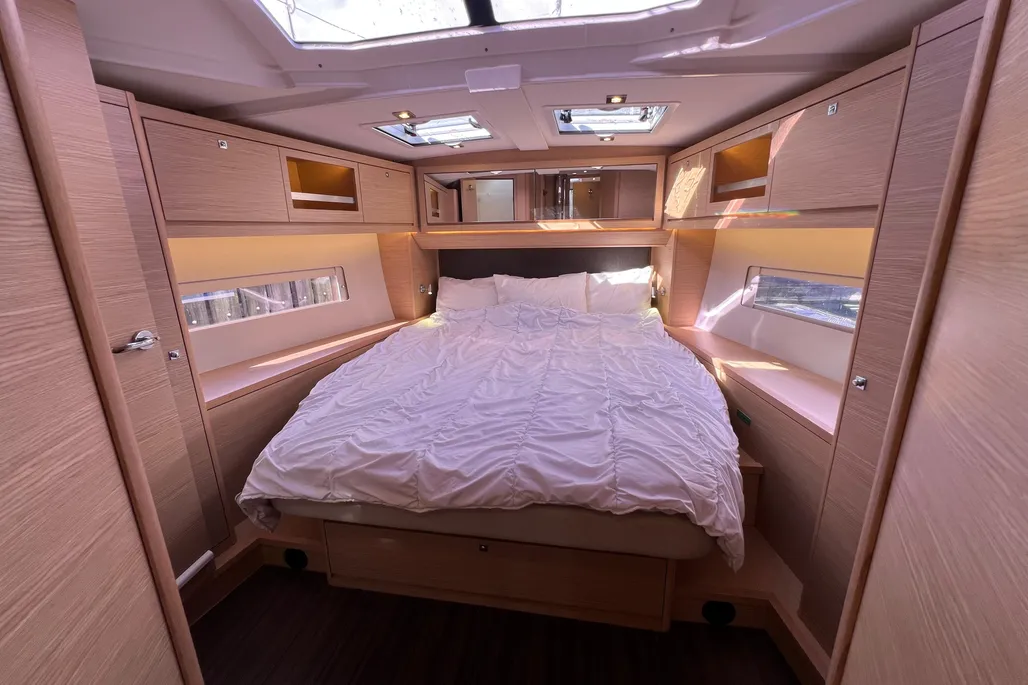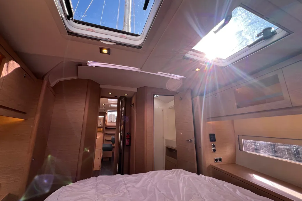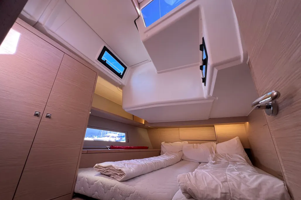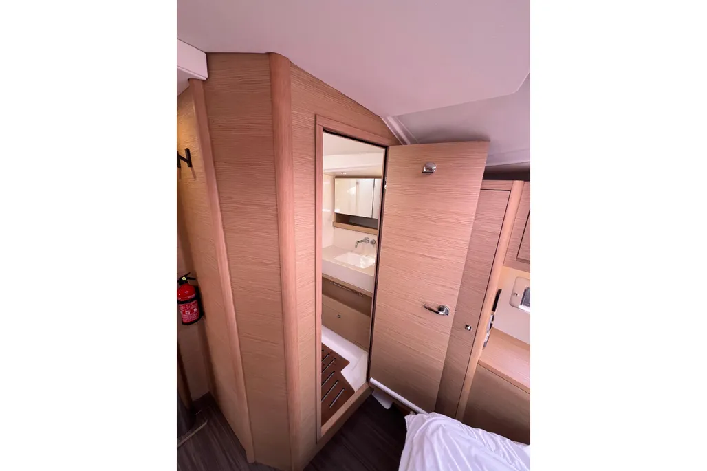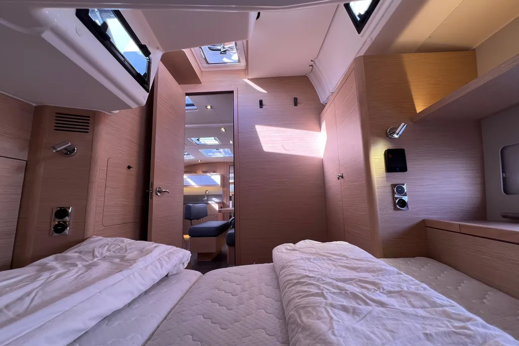 Dans cette configuration 3 cabines doubles / 2 salles de bains, complétée par une salle de douche séparée, l’aménagement privilégie le confort et la circulation à bord. Les cabines offrent de beaux volumes et permettent d’accueillir jusqu’à huit personnes pour la croisière.