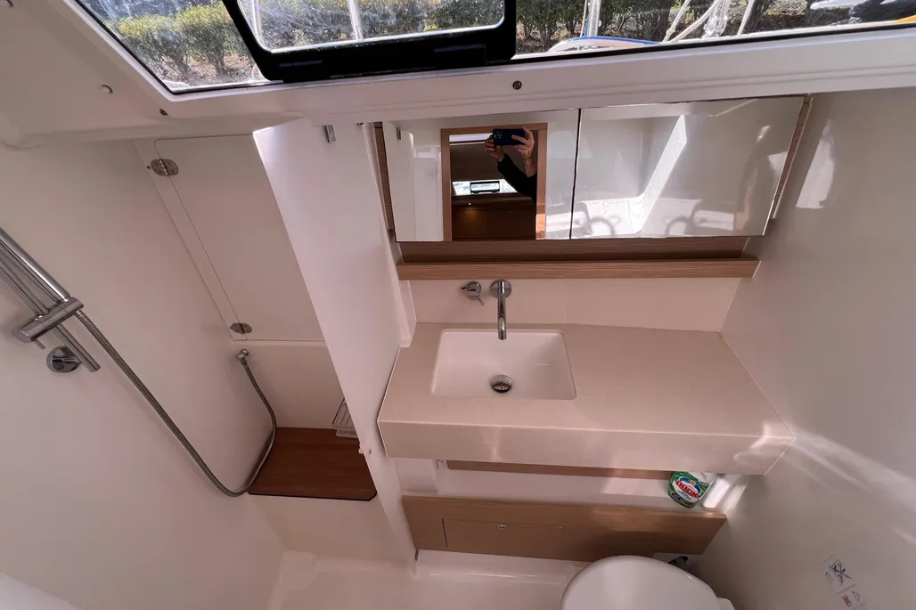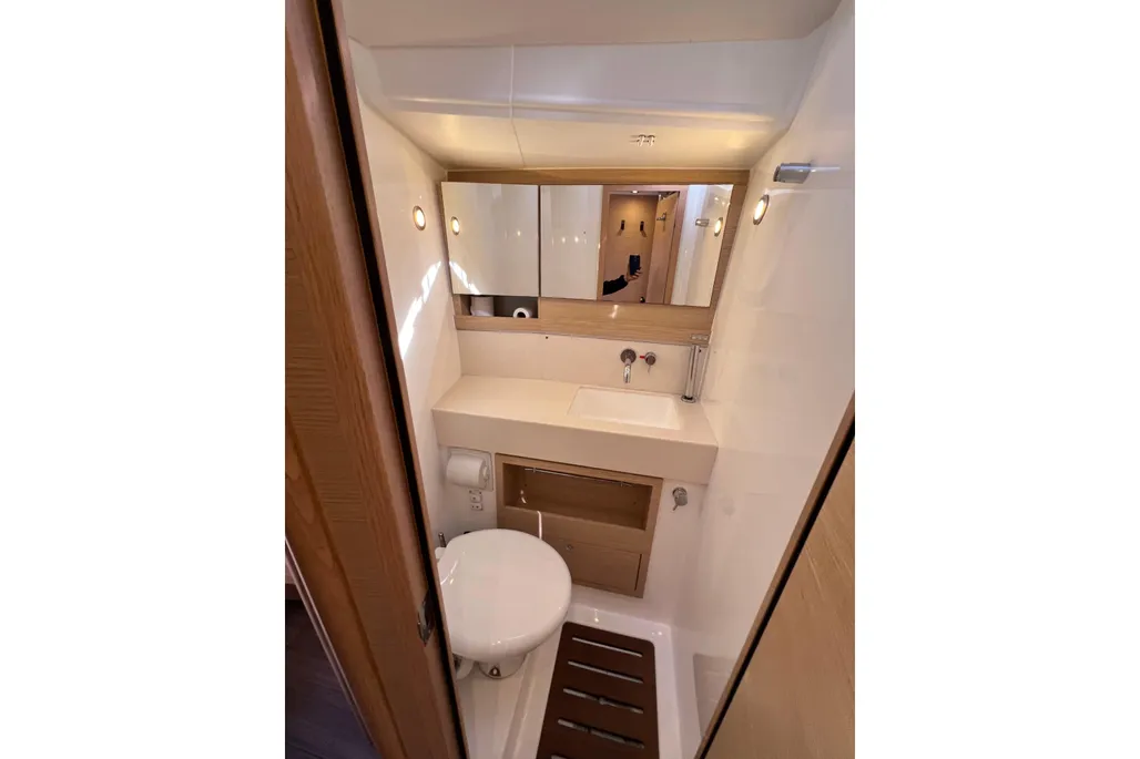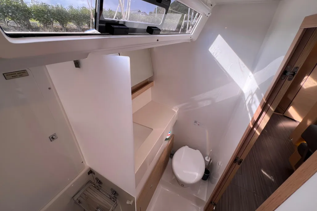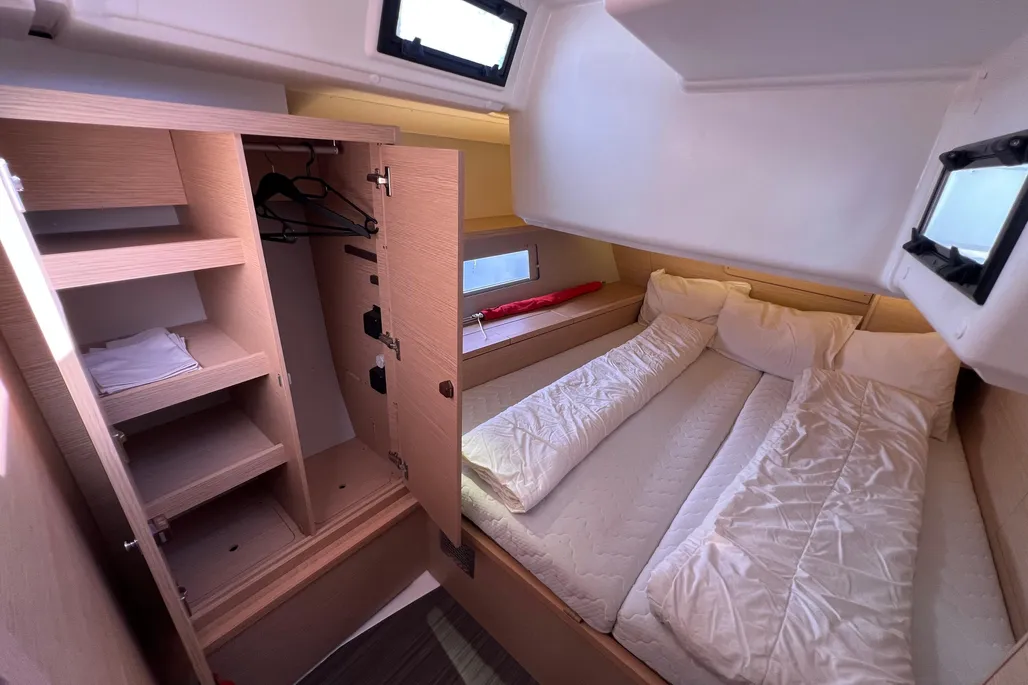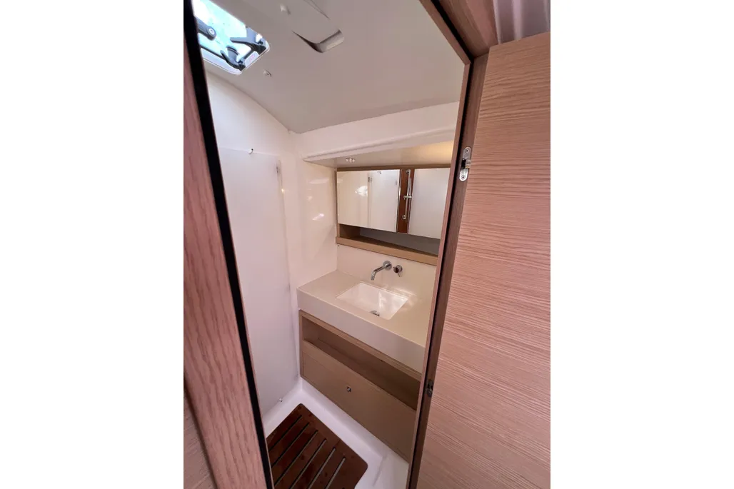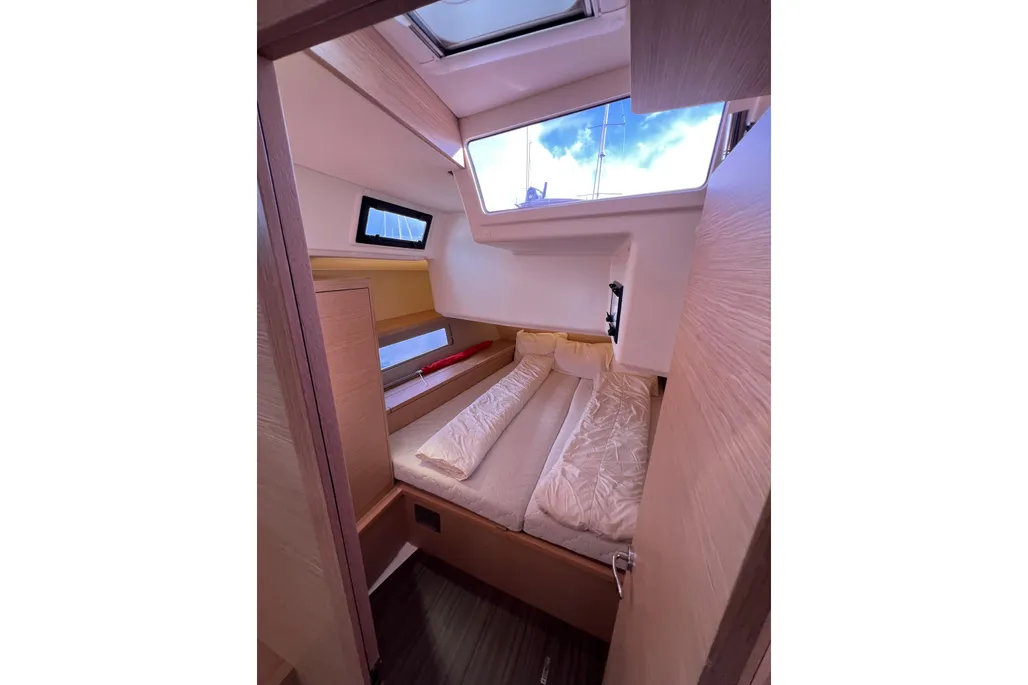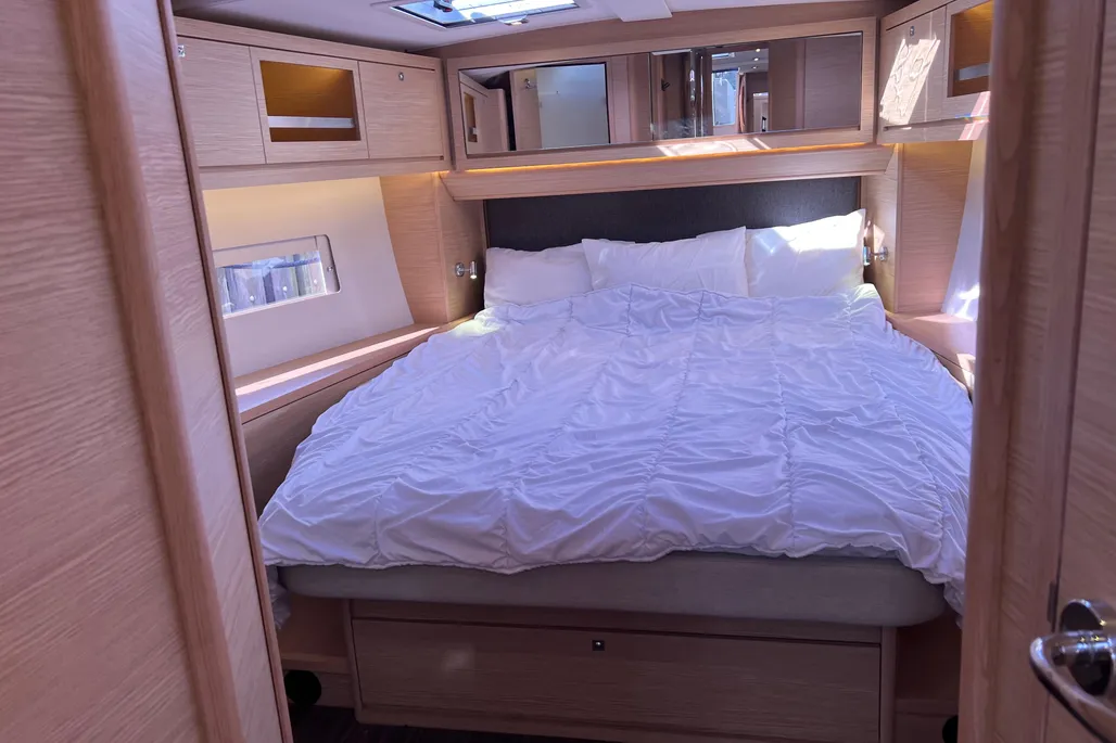Dans cette configuration 3 cabines doubles / 2 salles de bains, complétée par une salle de douche séparée, l’aménagement privilégie le confort et la circulation à bord. Les cabines offrent de beaux volumes et permettent d’accueillir jusqu’à huit personnes pour la croisière.